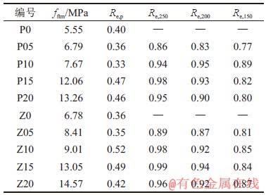 从表7还可以看出:在相同钢纤维掺量时Z组残余弯曲韧度比大于P组残余弯曲韧度。随跨中挠度增大,残余弯曲韧度比从Re,250到Re,150不断降低,说明SFHSLC残余弯曲强度随变形增大而降低。同时,相同掺量下,Z组残余弯曲韧度比降幅普遍比P组的小,说明Z组SFHSLC裂后持荷能力更强,残余弯曲强度较高。P10与Z10相比,虽然裂后韧性较低,但是相同挠度位置的残余弯曲韧度比却更大,这是因为P10弯曲行为为挠度软化,且加载过程中无明显弹塑性变形段。在到达峰值后,受试件脆性影响,荷载发生突降,但纤维的桥联作用使试件仍具有抵抗变形的能力,随位移增大,曲线得到二次上升,产生假挠度硬化现象,因此,Re,250与Re,200差异不大。Z10初裂荷载小于峰值荷载,弯曲行为为挠度硬化,此时试件具有良好的持荷能力,裂后曲线缓慢降低,不会出现假挠度硬化现象,因此,Z10的残余弯曲韧度比降低幅度更大。