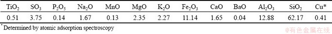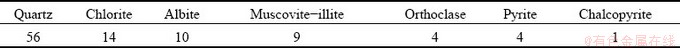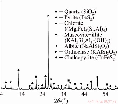The samples used in this study were obtained from the rejected portion of the SAG Mill of Sarcheshmeh copper concentrator (Kerman Province, Iran). A representative sample was obtained from the overflow of the SAG mill discharge screen. It contained a low-grade ore with a particle size of >5 mm. In order to characterize the ore, the representative sample was subjected to different chemical and mineralogical analyses. Chemical analysis by X-ray fluorescence (XRF) (model: Varian 735) (Table 1) showed that the sample contained 62.17% SiO2, 12.88% Al2O3, 3.75% SO3 and 0.41% Cu (determined by inductively coupled plasma-optical emission spectrometry (ICP-OES) (model: Varian 735)). The contents of gold and silver, analyzed by the fire assay method (SGS’s FAI313) and ICP-MS, were 3.1×10-8 and 2.1×10-6, respectively. These precious metals were not considered economic and were not investigated in this study. X-ray diffraction analysis (XRD) (Philips model D6792) of the sample showed that the sample contained chalcopyrite as the main valuable mineral in association with quartz and some gangue clayey minerals such as chlorite, albite and muscovite (Table 2 and Fig. 1). In order to determine the liberation degree of chalcopyrite, the mineralogical investigations on polished section prepared from a mixture of sample and molding powder (with a mass ratio of 1:10) were conducted by grain counting method using an optical microscope (model: Olympus BX53F). The results showed that the size of the most of the chalcopyrite grains (84%) was below 90 μm.