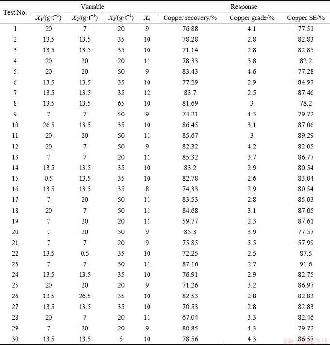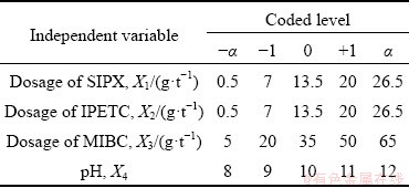 The effects of several parameters including the dosage of SIPX and IPETC collectors, the dosage of frother and pH level on the copper separation efficiency were investigated. The experimental range and levels of independent variables for the separation efficiency are given in Table 3.