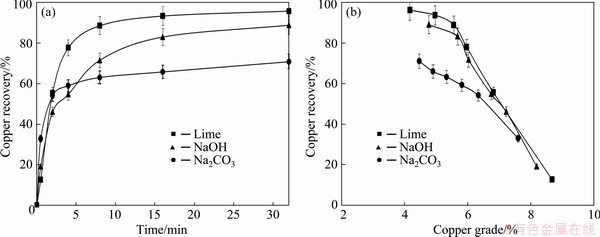 Fig. 3 Effect of pH regulator type on recovery-time (a) and recovery-grade (b) of concentrate in the presence of SIPX collector