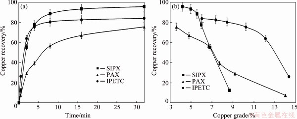 In order to investigate the influence of the type of collector and pH regulator on the copper flotation efficiency, some experiments were performed using three collectors namely PAX, SIPX and IPETC, and three pH regulators (pH value of 11) namely lime, Na2CO3 and NaOH. The diagrams of time-recovery and grade-recovery are plotted in Figs. 3 and 4, respectively. From Fig. 3(b) and 4(b), it could be concluded that maximum copper recovery occurs at minimum concentrate grade. As can be seen in Fig. 3 and Table 5, maximum copper recovery (94.2%) was obtained in the presence of lime as pH regulator and SIPX as collector where copper grade was 4.16%. However, in the presence of sodium carbonate, maximum flotation rate constant (1.22 min-1) and minimum recovery (64.2%), as well as maximum copper grade (4.77%), were achieved. Considering the related higher copper recovery and easier accessibility of lime as well as its lower price, lime was chosen as the more suitable pH regulator for the next experiments.