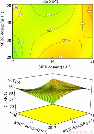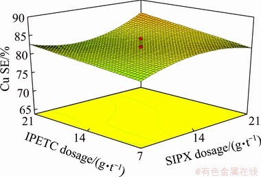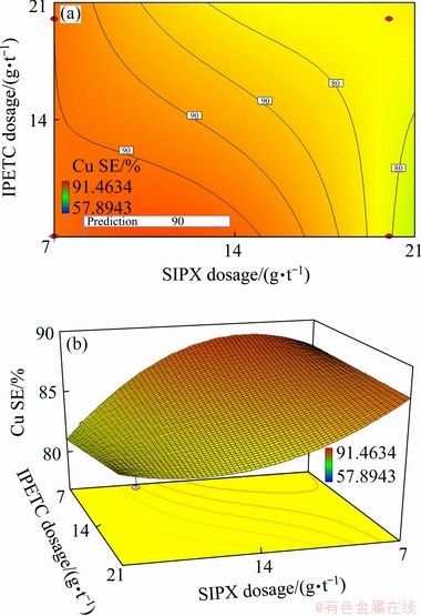 (3) The interaction effect between the collectors and the frother indicated that at the low dosage of SIPX (7 g/t), increasing MIBC dosage from 20 to 50 g/t enhanced the separation efficiency from 80% to 83%; while, at the high dosage of IPETC dosage (21 g/t) increasing the MIBC dosage decreased separation efficiency from 84% to 78%.