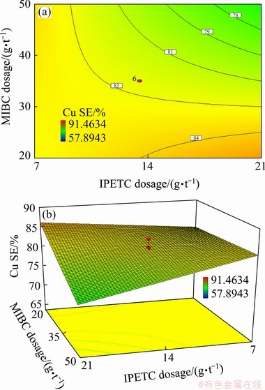 Fig. 6 Contour (a) and 3D (b) diagrams of interaction effect of MIBC and IPETC on copper separation efficiency at SIPX dosage of 13.5 g/t and pH of 10