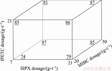 Fig. 7 Simultaneous mutual effect of IPETC, SIPX and MIBC on separation efficiency of copper (underlined values) at pH 10