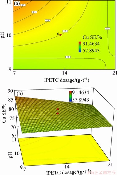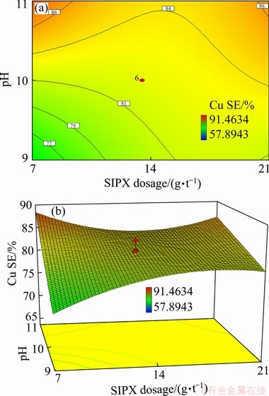 Fig. 8 Contour (a) and 3D (b) diagrams of interaction effect of SIPX and pH on copper separation efficiency in MIBC and IPETC dosages of 35 and 13.5 g/t, respectively