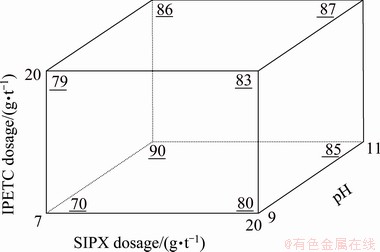 Fig. 10 Simultaneous mutual effect of IPETC, SIPX and pH on separation efficiency of copper (underlined values) at MIBC dosage of 35 g/t