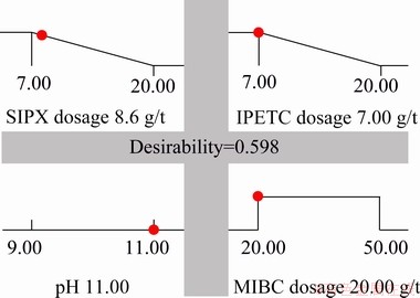 (5) The optimal conditions of flotation for copper efficiency, in the multi-factor experiments, were determined to be at SIPX dosage of 8.6 g/t, the IPETC dosage of 7 g/t, the MIBC dosage of 20 g/t and the pH of 11.