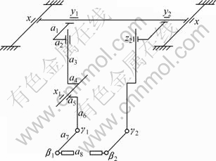 本文所研究的多自由度机械手的原理结构和连杆坐标系如图3所示。左机械手有3个独立的移动副和2个独立的转动副,右机械手有2个独立的移动副和2个独立的转动副。此外,左右手臂还共用1个移动副。其中:左机械手的6个关节变量分别为(x,x1,y1,z1,β1,γ1),右机械手的5个关节变量分别为(x,y2,z2,β2,γ2)。