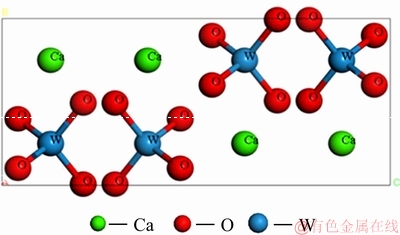 图1所示为白钨矿电子密度图和单晶胞图。白钨矿为四方晶系,为近八面体的四方双锥状,晶胞参数为,a0=b0=0.5243 nm,c0=1.1376 nm,α=β=γ=90°,Z=4,空间群为I4 1 /a。在晶胞中,W原子为中心原子,通过共价键与周围4个氧原子配位形成WO4四面体,W—O键长0.1778 nm。每个Ca2+与8个WO42-四面体中的八氧原子通过离子键形成八配位。Ca—O键长分别为0.2463 nm和0.2479 nm。WO4四面体是由Ca 联结起来,其一个二次对称轴与晶轴c平行,在c轴方向是一个被压扁的四面体,另外,2个二次对称轴与晶轴a、b相交45°,沿水平方向分布。白钨矿为离子晶体,其中的W原子与O原子以WO4四面体存在,W—O原子间不容易发生解离;而Ca2+相对容易从矿物晶体中解离,活泼性较高。