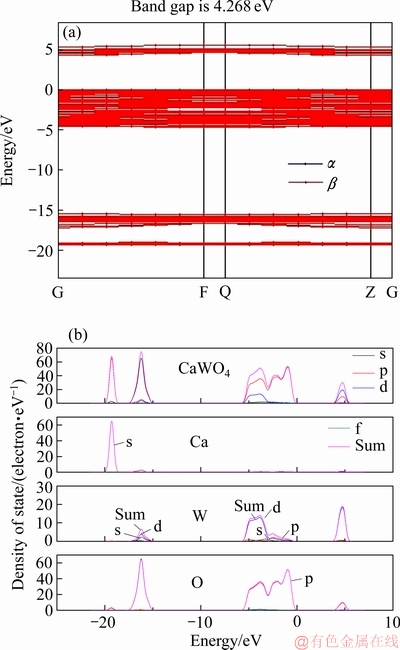 Fig. 2 Band structure(a) and density of state of atoms in scheelite (001) surface(b)