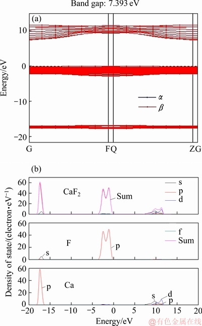 Fig. 3 Band structure(a) and density of state of atoms in (111) cleavage surface of fluorite(b)