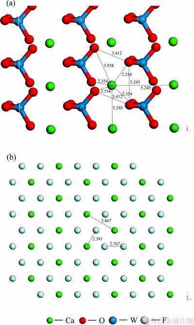 Fig. 4 Distribution of positive and negative charge particles in scheelite (001) cleavage surface(a) and fluorite(111) cleavage surface(b) (Unit: