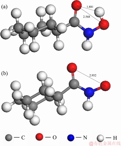 因此,本文以环己烷羟肟酸(CHA)为例,从空间角度分析羟肟酸与白钨和萤石吸附模型的结构差异,从而为捕收剂的设计提供指导。通过密度泛函理论计算表明环己烷羟肟酸的空间结构模型示意图如图5所示,环己烷羟肟酸分子和离子的空间结构参数分别见表1。