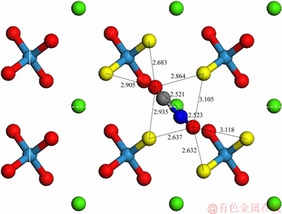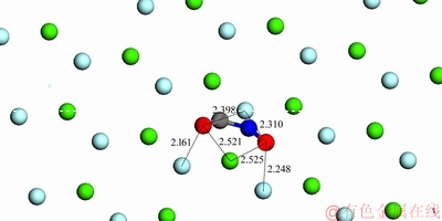 因此,采用量子化学模型从空间角度,对羟肟酸与矿物晶体表面模型进行分析。假设当环己烷羟肟酸与白钨矿(001)表面Ca2+形成单核配位螯合物,且羟肟基中O质点与表面Ca2+之间的距离约为0.252 nm时(Ca和O原子的共价半径之和),吸附模型图见图6(图中略去非极性基团,后同),羟肟基中O质点与矿物表面负电荷的O质点的最临近距离为0.2683、0.2637、0.2632、0.2864 nm(以与O质点之间的距离最大位置摆放为原则)。以上数据说明,当环己烷羟肟酸离子在溶液中靠近白钨矿(001)表面形成单核双配位结构时,羟肟酸官能团中的O质点与矿物表面Ca质点的距离小于这2个O质点与表面负电荷较高的O质点的距离,即意味着该羟肟酸基团的空间结构与矿物表面空间结构呈单核配位匹配,有利于形成稳定的吸附结构。