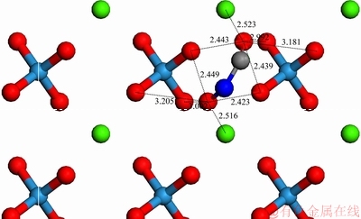 假设环己烷羟肟酸与白钨矿(001)面形成双核双配位吸附,羟肟基中两个O质点分别与表面两个不同Ca2+的距离约为0.252 nm,吸附模型示意图见图7,此时羟肟酸O质点与表面临近O质点的距离为0.2443、0.2439、0.2423、0.2449 nm。以上结果表明,环己烷羟肟酸阴离子与白钨矿(001)面形成双配位结构时,羟肟基中带负电荷的O质点与矿物表面Ca质点的距离小于O质点与矿物表面负电荷的O质点距离,此时静电吸引力方向上的原子距离小于静电斥力方向上的原子距离,与单核双配位模型相比,即意味着羟肟酸阴离子的空间结构与矿物表面空间结构呈双核配位匹配相对较差,不利于形成稳定的吸附结构。