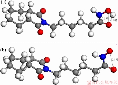 而从空间结构方面看,量子计算结果表明,电离后HHHA羟肟酸离子中,酮基氧中O18质点与羟基中O质点的空间距离为0.2893 nm,而环己烷中2个O质点的空间距离为0.2948 nm。