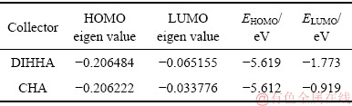 新型DIHHA分子的前线轨道特征值及能量值见表2。然而,前列已经分析了含钙矿物与捕收剂反应的前主要为静电控制反应,捕收剂的前线轨道对反应影响不大,因此不做过多分析。