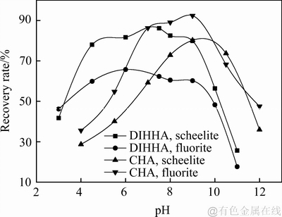 图12 pH对矿物浮选回收率的影响(CHA或DIHHHA浓度为40 mg/L)