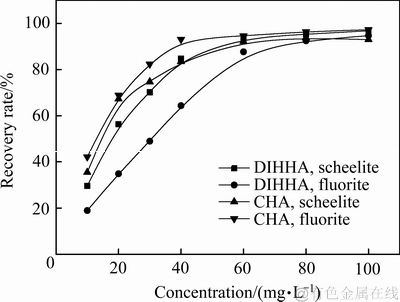 从图13可以发现,在0~100 mg/L的浓度范围内,两种矿物的浮选回收率都随着两种捕收剂浓度的增加,但是当浓度超过80 mg/L时,浮选回收率的增加已经不明显。在10~60 mg/L范围内,CHA对萤石和白钨矿的捕收能力强于DIHHA的,而DIHHA对白钨矿的捕收能力明显强于对萤石的。整体上,DIHHA对白钨矿显示出更好的选择性,CHA对含钙矿物的捕收能力强于DIHHA。该浮选实验结果与先前的理论计算推断结果相一致。