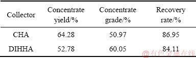 由表3可知,CHA具有较强的捕收能力,其产品的产率更高,但是DIHHA显示出对白钨矿和萤石浮选分离的更好选择性,在两者精矿产品回收率相差不大的情况下,使用DIHHA作为捕收剂的精矿产品的品位比使用CHA的精矿品位高出近10%。证明了论文前列理论研究结果的正确性。