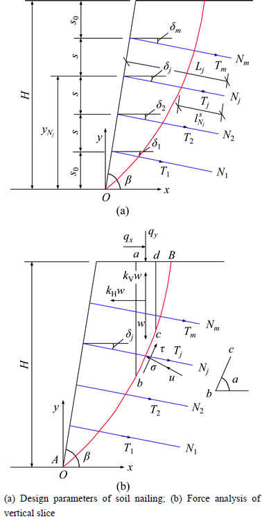 Soil nailing, as one of the slope stabilization techniques, has been widely used in upgrading cut slopes [1–4], and is particularly useful for strengthening the existing slopes [5], because of their low construction cost, simple installation procedure, and the ease and speed of construction [6, 7]. The fundamental concept of soil nailing is to reinforce the soil with closely spaced passive inclusions to create a coherent gravity structure, and consequently increase the overall shear strength of the soil in situ, restraining its displacements [8, 9]. In order to assess the stability of a slope reinforced with soil nails, the limit equilibrium method (LEM) [10, 11] is usually adopted. For instance, WEI et al [9] developed the LEM for analyzing the stability of a soil nailed slope based essentially on Spencer’s method; DENG et al [12] and DONG et al [13] analyzed the stability of a soil nailed slope under earthquake using LEM; and TAO et al [14] established the improved general LEM for analyzing the stability of a soil nailed slope. Further, a numerical simulation method [9, 15–17] and failure probability method [2] are also used to study the reinforcement effect of soil nailing in the soil nailed slope. However, in these studies, practical charts for easily analyzing the soil nailed slope stability have not been drawn, and methods to design optimally the parameters of soil nailing for the slope with a certain safety requirement have not been considered.
