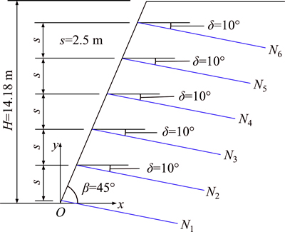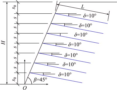 The parameter m, i.e., the row number of soil nails arranged in the slope along the vertical direction, can be determined from the slope height H and spacing s of soil nails in the vertical direction as