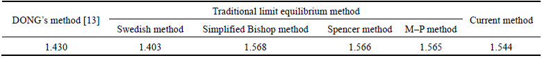 Table 3 shows that 1) compared with the previous result, the current method has only a little difference, indicating the feasibility of the current method;2) compared with the results of the traditional LEM, the current method yields values larger than those from the Swedish method, and values close to those from simplified method, Spencer method and M–P method, indicating that the current method can provide an strict solution. The reason is that the current method satisfies all the static equilibrium conditions of a sliding body, despite it being established based on the initial normal stress on the slip surface without considering the effect of inter-slice forces.