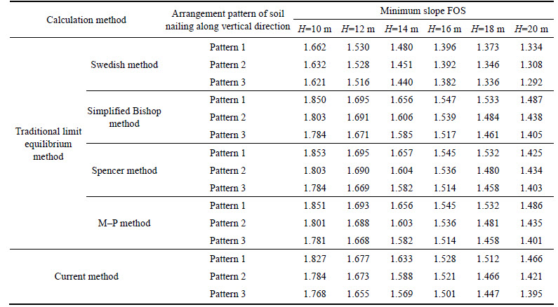 Example 2. In the slope shown in Fig. 3, the slope shape, soil parameters, and design parameters of soil nailing are the same as those in Example 1. Three patterns of arrangement of soil nails along the vertical direction are adopted as follows: 1) Pattern 1: the length of all the soil nails are 0.8H with spacing s in the vertical direction being 0.10H; 2) Pattern 2: the length of all the soil nails are 0.8H with spacing s in the vertical direction being 0.12H; 3) Pattern 3: the length of all the soil nails are 0.8H with spacing s in the vertical direction being 0.14H. In all the three patterns, the spacing of soil nails in the horizontal direction is unity. The vertical distance s0 can be determined using Eq. (2). For slope heights H of 10, 12, 14, 16, 18 and 20 m, respectively, the results obtained using the Swedish method, simplified Bishop method, Spencer method, M–P method, and the current method are listed in Table 4.