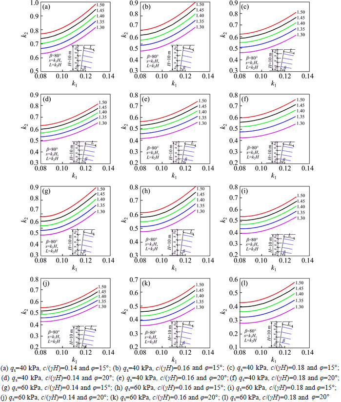 As soil nailing is usually adopted to reinforce deep and steep slopes, the slope parameters are assumed as follows: slope height H=10 m, and slope angle β=80°. Let the natural unit weight of soil γ=18 kN/m3, and the design parameters of soil nailing are as follows: diameter of anchor bolt d=18 mm, diameter of anchoring body D= 100 mm, tensile strength of anchor bolt fy=310 MPa, and the horizontal inclination angle of soil nails δ=10°. The spacing of soil nails in the vertical direction is assumed as s=k1H with the spacing in the horizontal direction being unity, and the length of soil nails is assumed as L= k2H, where k1 and k2 are the proportional coefficients. The FOS contour curve charts for the stability analysis of soil nailed slopes is drawn under the following conditions: 1) the values of dimensionless parameter c/(γH) are 0.14, 0.16 and 0.18; 2) the soil internal friction angle φ=15° and 20°, and 3) the soil ultimate friction resistance qs=40 kPa and 60 kPa. These charts are shown in Fig. 4.