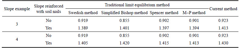 The followings are the known parameters in Examples 3 and 4: H=10 m, β=80°, c/(γH)=0.146, φ=15°, δ=10°, and qs=45 kPa. According to Fig. 4, and using the linear interpolation relationship, the following details can be inferred: 1) In Example 3, the length of soil nails (L) should be equal to 6.976 m to ensure a slope FOS of 1.4; 2) In Example 4, the spacing of soil nails (s) in the vertical direction should be 1.00 m to ensure a slope FOS of 1.4. The results obtained from the Swedish method, simplified Bishop method, Spencer method, M–P method, and the current method are listed in Table 5, using the above design parameters of soil nailing to analyze the stability of soil nailed slopes.
