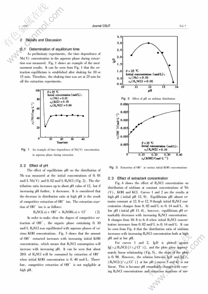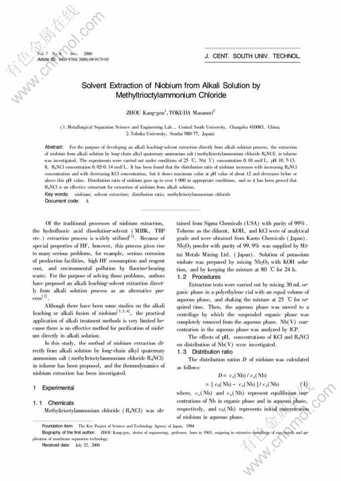 Key words:niobium; solvent extraction; distribution ratio; methyltrioctylammonium chloride