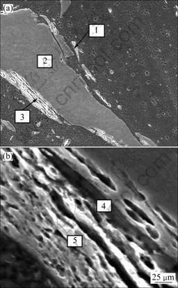 采用扫描电镜在较高倍数下观察接头的微观组织并进行能谱分析,其结果如图2所示。从图2(a)中可知,焊核区铝合金基体上分布的颗粒有两种类型,一种颗粒的尺寸较小,呈细长条状,颗粒中间局部发亮(如图2(a)中的区域1);另一种颗粒尺寸较大(如图2(a)中的区域2),整体呈暗灰色,边缘有少量发亮的条带(如图2(a)中的区域3),对区域3(即发亮的条带)进行进一步放大,发现是由黑色条带(如图2(b)中的区域4)和白亮条带(如图2(b)中的区域5)间隔组成。