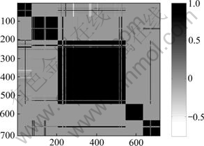 在KECA分析中,对瑞利熵值贡献最大的5个主成分分别为第2,1,8,6和17主成分。保留前5个对熵贡献最大的主成分,计算相应的角距离,得到对应的cos值矩阵如图4所示,可以看到cos值矩阵具有明显的分块特性。