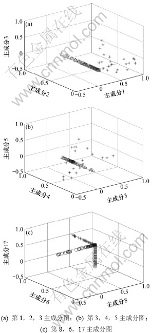 而在KPCA分析中会选择特征值最大的前5个主成分,即第1~5主成分。首先给出对应特征值最大的第1,2,3主成分投影得到的数据,如图5(a)所示。由图5(a)可以看到:最大特征值对应的前3个主成分难以有效刻画数据的本质特性,难以在空间中将数据有效分离。为了形象给出2种方法的差异性,选择2种方法中差异的主成分,即给出了在第3,4,5主成分和第8,6,17主成分投影得到的数据,分别如图5(b)~(c)所示。从图5可以看到:KECA分析中,第8,6,17主成分分别对应一类数据,具有明显的角结构特性,可以有效地提取数据的本质特性,有利于数据的聚类分析,而KPCA分析中选用的主成分不能有效表现数据的类别特征。表2给出了实际类别和KECA聚类后各类别的样本数,总体正确率为95.68%,聚类结果较为理想。而且,通过检测聚类错误样本的力学性能,发现均处于该钢种所要求的边界。在实际的生产中应尽可能避免这种情况的发生,因为其处于降级或改判为其他钢种的边缘。