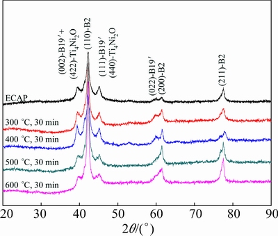Figure 1 shows the XRD patterns of differently treated samples. All of the patterns can be indexed as a mixture of B2 parent phase, Ti4Ni2O phase and B19′ martensite. It should be pointed out that the existence of R phase cannot be excluded because the (112) peak of R phase is very close to the (110) peak of B2 parent phase [22,23]. The formation of Ti4Ni2O phase in Ni-rich TiNi alloys results from the introduction of oxygen during melting [24]. The appearance of B19′ martensite is possibly related to the strain-induced martensite during ECAP [6]. With increasing the annealing temperature, the intensities of peaks corresponding to B19′ martensite gradually decrease because the volume fraction of martensite decreases. This indicates that the strain- induced B19′ martensite is unstable and can be restored by annealing. The strain-induced B19′ martensite may be stabilized by the high density dislocations introduced during ECAP. During annealing, the recovery and recrystallization occur. As a result, the rearrangement and elimination of dislocations take place, leading to the reduction of volume fraction of B19′ martensite with increasing the annealing temperature.