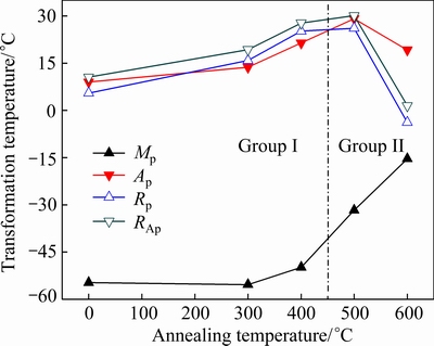 3) When the annealing temperature is less than 400 °C, the transformation temperatures increase with increasing the annealing temperature. When the annealing temperature is higher than 500 °C, the martensitic transformation temperatures increase, but the B2-R transformation temperature and reverse transformation temperatures decrease with increasing the annealing temperature.