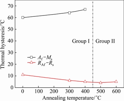Fig. 5 Effect of annealing temperature on transformation hysteresis of as-ECAP processed Ti49.2Ni50.8 alloy