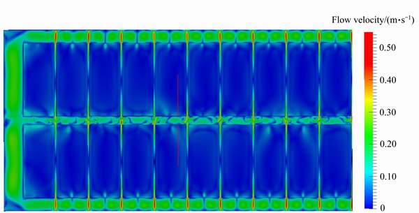 提取CFX计算的300 kA铝电解槽内阳极气泡的作用力[23],通过源项添加的方式加入到电解质动量方程中,得到如图3所示的阳极气泡作用下电解质流场分布图。