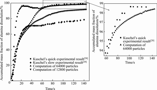 图4中KUSCHEL等[28]的实验为在一个固定圆筒容器中加入搅拌器来模拟实际电解质流动,KUSCHEL等[28]将氧化铝溶解实验分为两种情况,第一种是快速溶解实验,将氧化铝快速分散的倒入电解质中,目的是尽可能地避免氧化铝颗粒聚集而形成结块,加快氧化铝溶解;第二种是普通下料无搅拌,考虑了颗粒因聚集而结块的情况,溶解速度较慢。实际电解槽测量氧化铝溶解较为困难,利用与本文计算工况近似的Kuschel实验来进行对比分析:分别选择下料12800个计算颗粒与64000个计算颗粒来代表1.8 kg总的氧化铝颗粒数,研究计算颗粒数对计算结果的影响,选择模拟结果更贴近实际的颗粒数进行分析。