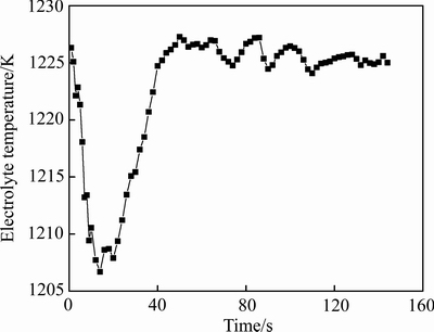 4) 仅考虑氧化铝溶解吸热的情况下,下料区位置电解质温度在前14 s快速下降,随后在电解质流动作用下该区域由温度较高的电解质补充,温度快速回升,之后因氧化铝的溶解吸热以及电解质的对流扩散,下料区电解质温度呈震荡变化。