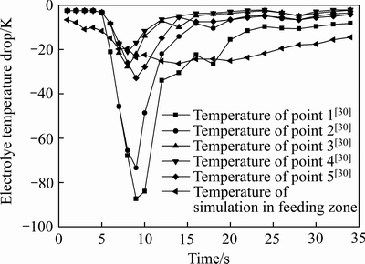 由图6可知,在下料后的前14 s左右,此时属于氧化铝快速溶解阶段,分散型小颗粒快速溶解而大量吸热,电解质温度由初始的1233 K(960 ℃)迅速下降,温度最多下降达26 ℃,这与相关文献实验得出的电解质在10 s左右降温到最低点,随后温度逐渐上升的结果接近[30-31]。在14 s之后,电解质的流动将下料区温度较低的电解质经对流扩散开,得到周围温度较高的电解质补充使得下料区温度快速升高。此外,在60 s之后温度呈现震荡趋势,这是由于部分氧化铝颗粒还处于下料区未被冲走,以及其余地方温度较低的电解质流过来造成温度震荡。由于本文作者重点研究氧化铝溶解的吸热过程,而要同时耦合铝电解槽热平衡计算则难度较大,因此忽略了极距间电流对电解质的加热,导致最后下料区温度不能上升到初始电解温度1233 K,但总体温度变化规律与实验结果是接近的,比较结果如图7所示。