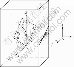 本文在计算复合裂纹的应力强度因子时采用的方法是将复杂的裂纹分解成Ⅰ,Ⅱ和Ⅲ型分量,然后进行分别计算。以试样的厚、宽、长3个方向取直角坐标XOYZ(见图3),空间斜裂纹在试样正面(XOY)上与OY的夹角为α,在试样侧面(XOZ)上与OX的夹角为β,试样受铅垂力P的作用,P平行于Z轴,空间斜裂纹的裂纹面为平行四边形,外力P在裂纹面上可分解为 PⅠ,PⅡ和PⅢ 3个分力。其中:PⅠ为垂直于裂纹面的拉力,产生Ⅰ型应力强度因子,PⅡ和PⅢ在裂纹面内;PⅡ为垂直于裂纹前端的剪力,产生Ⅱ型裂纹应力强度因子;PⅢ为平行于裂纹前端的剪力,产生Ⅲ型裂纹应力强度因子。坐标原点O(0,0,0)取在裂纹面上。在裂纹面上还可取A(-1,0,tan β)和B(0,-1,tan β) 2点,由此可得裂纹面内的矢量OA={-1,0,tan β}和OB={0,-1,tan α},由于裂纹前端与裂纹的切口线平行,所以PⅢ//OA={-1,0,tan β}。PⅠ垂直于OA和OB,故PⅠ//(OA×OB)={tan β,tan α, 1},PⅡ//[(OA