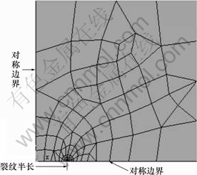 在建模时,取平板的宽度b=0.2 m,裂纹长度为2a,材料的弹性模量为2.23×1011 Pa,泊松比为0.36。考虑到裂纹的对称性,有限宽板的建模只考虑1/4的模型即可,网格如图4所示。
