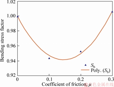Figure 9 Normalized bending stress factor variation with increasing frictional coefficients