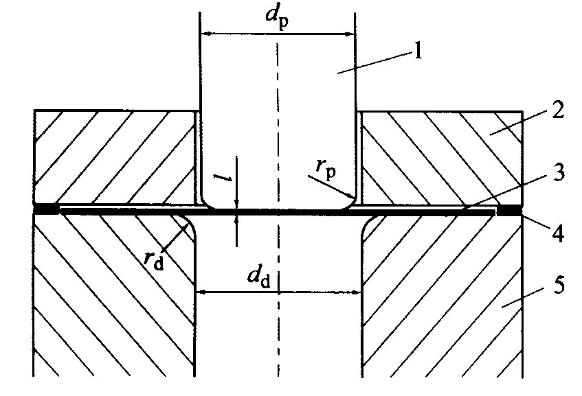 图1 极限拉深比试验模具简图 Fig.1 Scheme of tooling for RLD test 1—Punch; 2—Blank holder; 3—Circular blank; 4—Spacer; 5—Female die