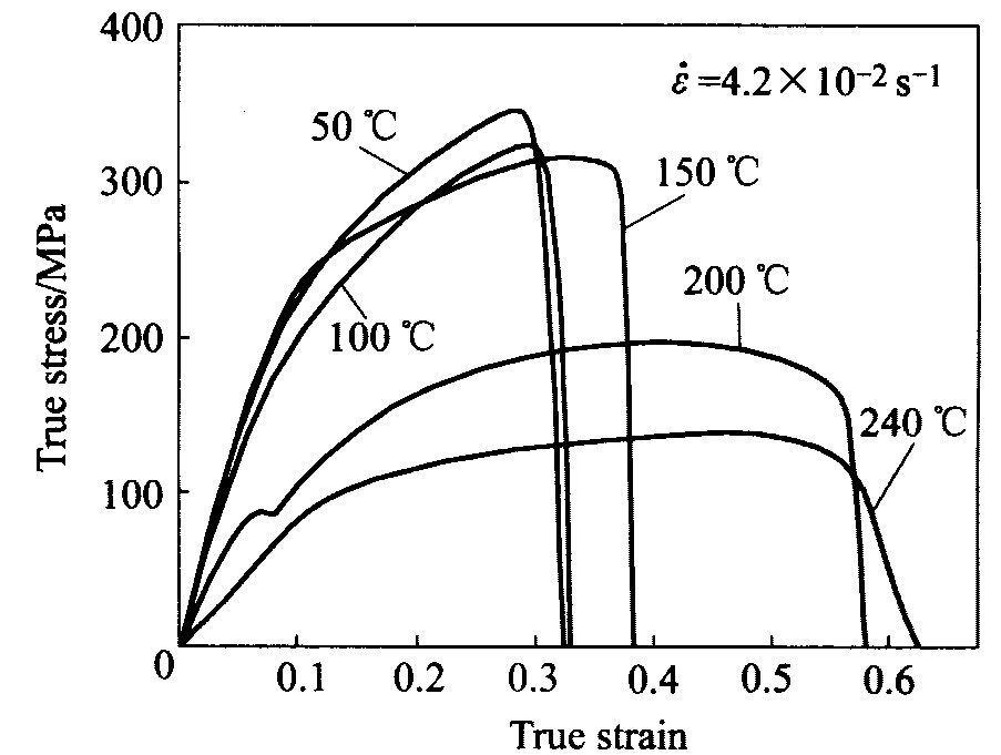 图2所示为AZ31镁合金的单向拉伸试验中, 应变速率恒为4.2×10-2 s-1 , 温度在50~240 ℃范围内变动时的流动曲线。 从图2可以看出: 当应变速率保持不变, 拉伸强度(σ b )随着温度的升高而减小, 而总延伸率则随温度的升高而增加。