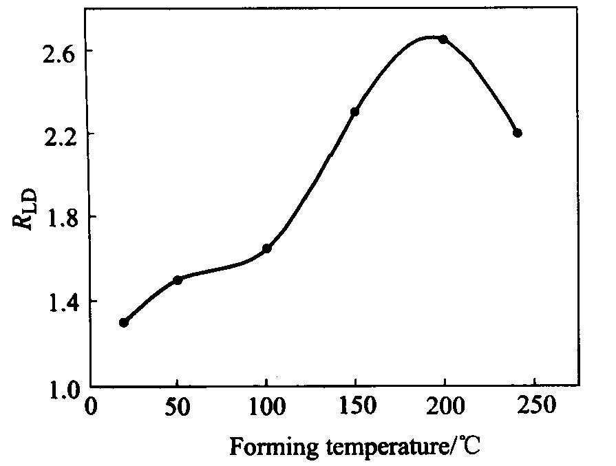 ℃温度范围内, AZ31镁合金在200 ℃具有最佳的拉深性能, 最大R LD 可达2.65。