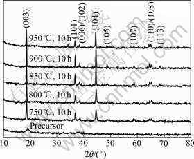 图1 不同温度10 h合成的Li(Ni3/8Co3/8Mn2/8)O2的XRD谱