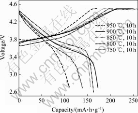 Fig.2 Initial charge-discharge profiles of Li(Ni3/8Co3/8- Mn2/8)O2 synthesized at different temperatures and 0.1C