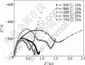 Fig.3 Impedance patterns of Li(Ni3/8Co3/8Mn2/8)O2 powder synthesized at various temperatures for 10 h